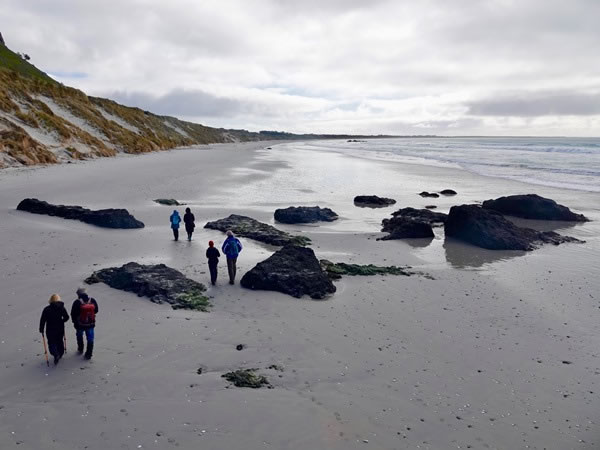 Six members of our party heading west along Maunganui beach. Cape Pattisson is just visible on the horizon.