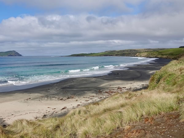 A beach on the east coast of Pitt Island. Part of South East Island / Rangatira can be seen on the left-hand edge of the picture.