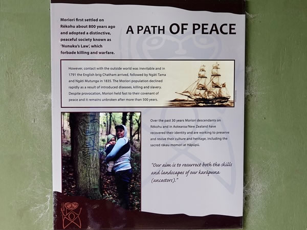 History: Moriori developed a unique and distinct culture. Among other aspects, their culture involved adherence to Nunuku’s Law – a “covenant of peace [that] forbade killing and warfare.” They also created a unique set of dendroglyphs – i.e., carvings on kopi trees. |