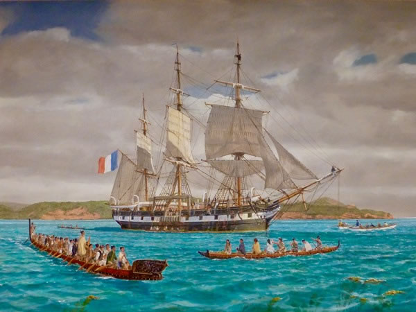 History: This is a painting by Roger Morris that was specially commissioned by the Hotel Chathams. It is of the Jean Bart, a French whaler, that arrived in Petre Bay in May 1838. Maori canoes – waka – are in the foreground, preparing to visit the ship. A misunderstanding led to a major skirmish between the Maori and the visiting French sailors. Maori commandeered the Jean Bart, and sank the whaler on the far side of Petre Bay. Five months later, a French naval corvette, Heroine, arrived in the Chathams intent on revenge. Using canon fire, the French destroyed Maori homes and canoes – including the impressive waka in the lower left-hand corner of Roger Morris’ painting. However, the French clearly appreciated fine art, and … |