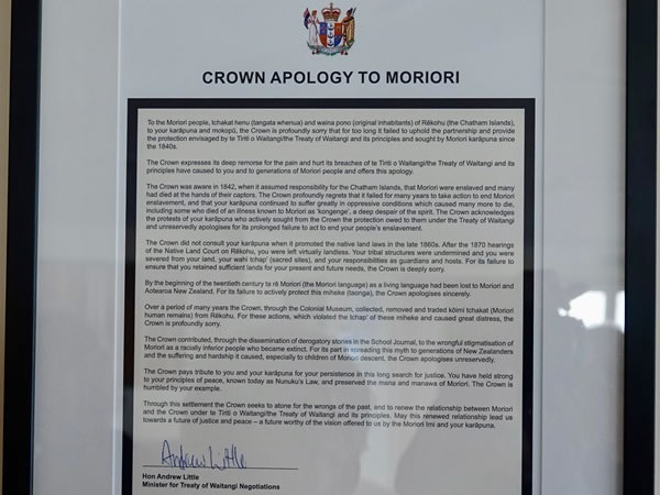 History: The Kopinga marae houses the Crown apology to Moriori. Among other things, the Crown apology – which was signed in early 2020 – says, “The Crown … unreservedly apologises for its prolonged failure to act to end your people’s enslavement. … Through this settlement the Crown seeks to atone for the wrongs of the past, and to renew the relationship between Moriori and its Crown under Te Tiriti o Waitangi / the Treaty of Waitangi and its principles.” |