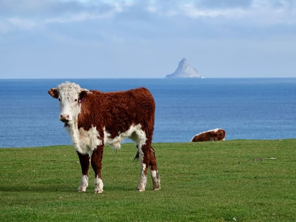 A young bull on a farm on the east coast of Pitt Island. An island called the Pyramid / Tarakoikoia can be seen on the horizon.