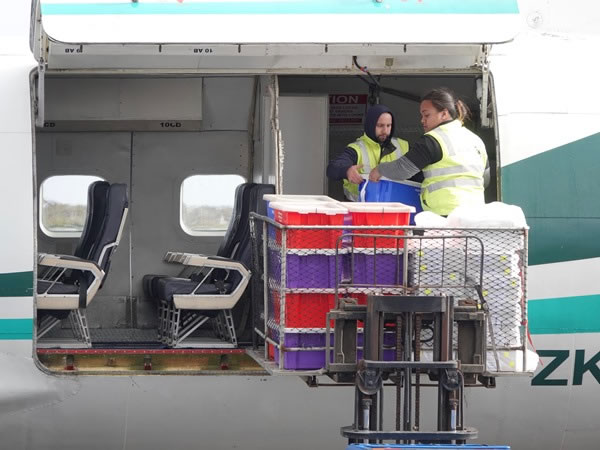 Loading freshly-caught fish onto an Air Chathams Convair 580 prior to flying the cargo from the Chatham Islands to the mainland.