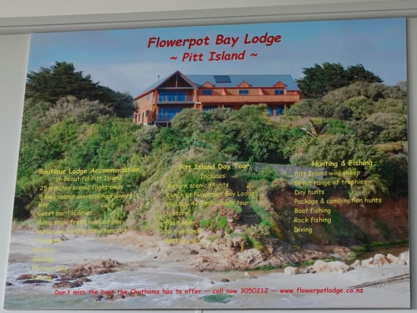 An advertising poster in the Chatham Islands’ airport terminal for the Flowerpot Bay Lodge on Pitt Island, and …