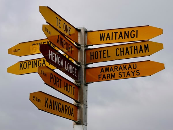 The signpost at one of the major junctions on Chatham Island – from here you can go south to Waitangi; east to Owenga; or north to Te One, the airport, Port Hutt, and Kaingaroa.