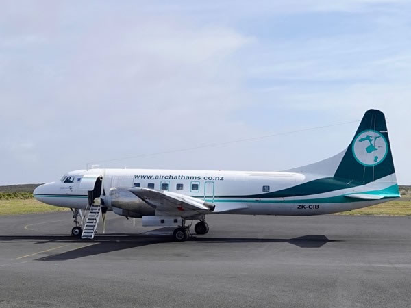 An Air Chathams Convair 580 on the tarmac at the airport, which is located on a spit of land jutting into the western side of the Te Whanga Lagoon.