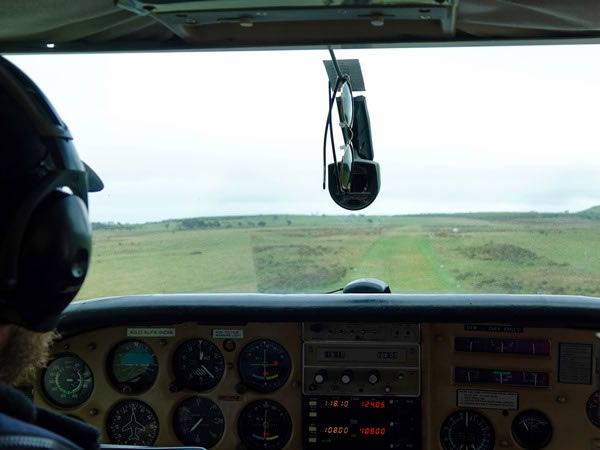 Transport: On Monday, 21 September 2020, ten of us flew – five passengers at a time – in an Air Chathams Cessna 206 from the airport on Chatham Island to Pitt Island. This is a photograph of Nick Nickoloff, the pilot, about to land the Cessna on Pitt Island’s grass runway. |