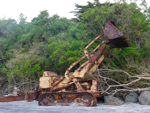 Rusting and abandoned: a front-end loader on the Owenga sea-front.