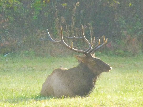Shortly after entering the Great Smoky Mountains National Park, I stopped to look at a herd of elk, including this magnificent male snoozing in the early morning sunshine. Elk are known as wapiti in New Zealand, where the first herd was a gift from President Theodore Roosevelt in the early years of the 20th century. |