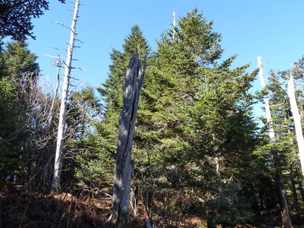 Live conifers and dead conifers in a clearing near the summit of Clingmans Dome.