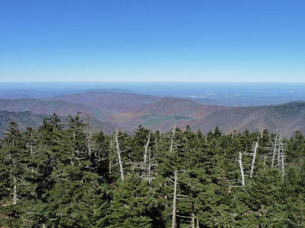 Looking north from the top of the observation tower on Clingmans Dome. The dead trees that are visible in this picture (as, indeed, they are in all the photos I took from the top of Clingmans Dome) are, at least in part, a result of increased levels of air pollution and acid rain in the eastern states of the USA. |