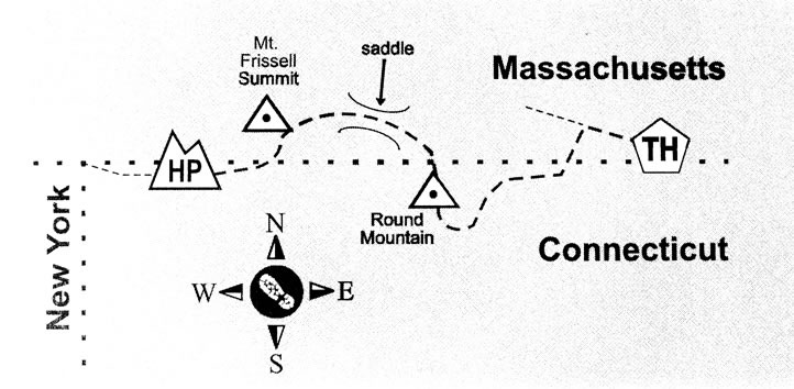… and this diagram in Charlie and Diane Winger’s excellent book, Highpoint Adventures: The Complete Guide to the 50 State Highpoints, shows why. From the trailhead, which is on the western side of Mt Washington Road and is actually in Massachusetts, the trail to the Connecticut state highpoint initially heads though part of Massachusetts. It then wends its way back into Connecticut and up Round Mountain. The trail crosses into Massachusetts again and skirts the summit of Mt Frissell before it finally goes back into Connecticut and reaches the highest point in the state. |