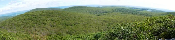 A three-shot panoramic photograph from the highest point in Connecticut looking south-east towards Round Mountain (which is in the middle distance near the left of the picture), Bear Mountain (which is immediately behind Round Mountain and – at 2,316 feet / 706 metres above sea-level – is the highest peak wholly within the state of Connecticut), Gridley Mountain (the round peak near the centre of the picture), and Riga Lake (which is near right-hand edge of the panoramic picture).