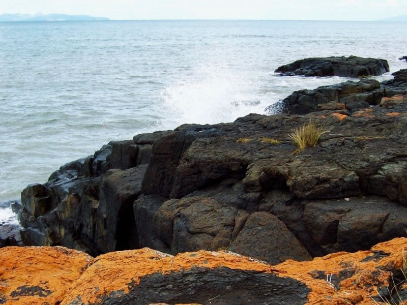 Orange lichen and dark brown rocks on the edges of the Swansea headland.