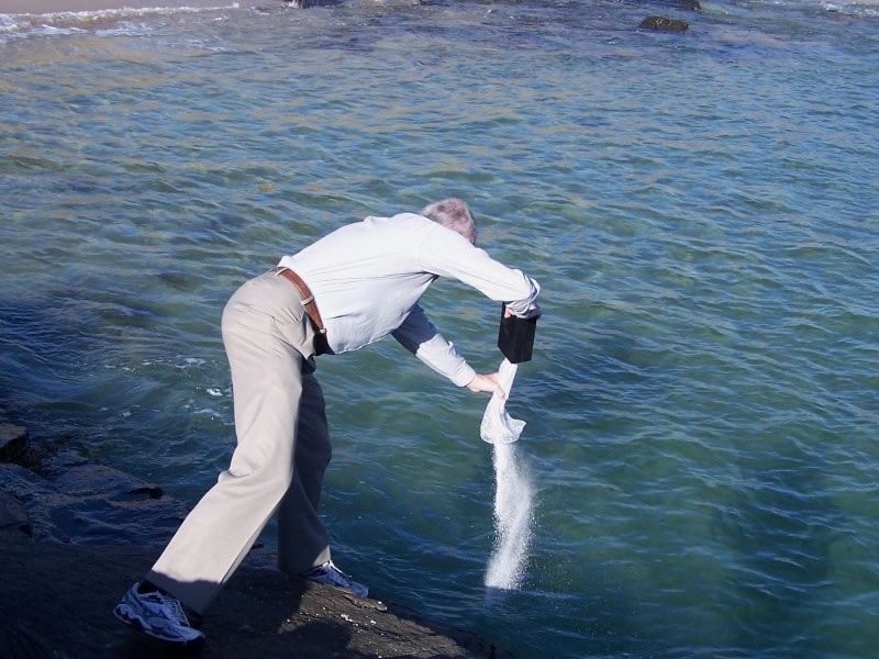 … Stuart took this photograph of me scattering Bobby’s ashes in the sea off Spiky Beach.