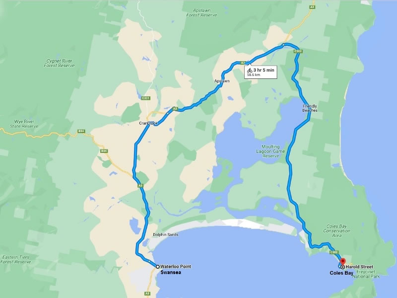 Thursday, 5 January 2006 – From Swansea to Coles Bay: After Stuart and I had scattered Bobby’s ashes, we drove back to Swansea, where we had breakfast and I got ready for the last leg of my four-day bike ride. As this map shows, I had to cycle an almost 60-kilometre loop from Swansea round the Moulting Lagoon Game Reserve to Coles Bay, which is due east of Swansea. |