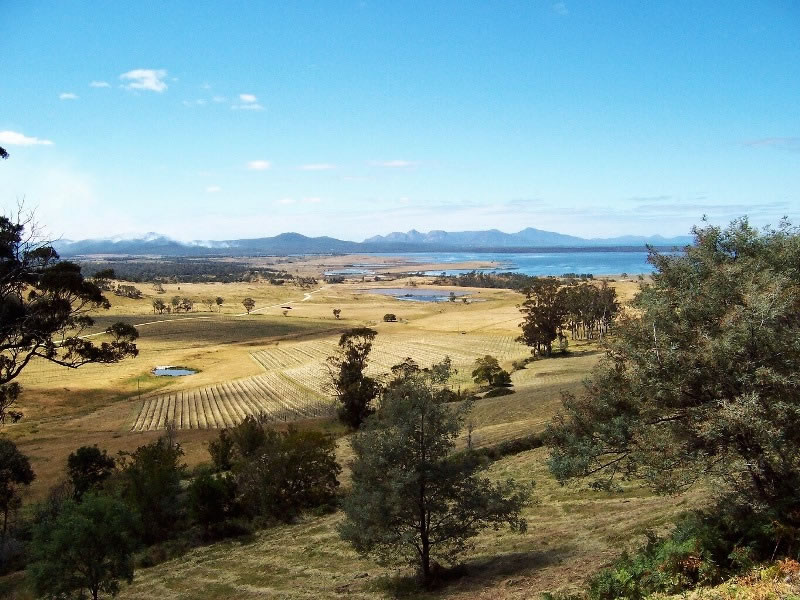 Thursday, 5 January 2006 – From Swansea to Coles Bay: After a tricky, twisting climb, I knew that the toughest part of the whole ride was behind me when I coasted down to this spot with its magnificent view across new vineyards in the foreground, the Moulting Lagoon in the middle distance, and the Hazards and the Freycinet Peninsula on the skyline. |