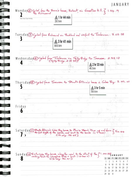 Thursday, 5 January 2006 – From Swansea to Coles Bay: This is a photograph of a page in my 2006 diary. I kept a careful record of my cycling times, and wrote them down in red ink in my diary. Under each day’s brief summary of my ride, I’ve added Google Maps estimate of the cycling time for the route I took. On three of the four days (i.e., on 2 January, 4 January, and 5 January), Google’s estimated times and my actual times were very closely aligned. On 3 January – the second day of my four-day ride – I was markedly quicker than Google’s estimate because I’d had a strong tailwind. To this day I am proud of the fact that I cycled the entire way (in round numbers, 200 kilometres) without once getting off to push my bike. |