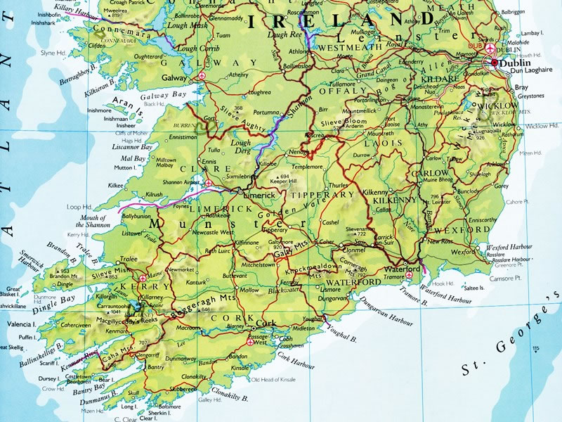 Introduction: This is a map of the southern half of the Republic of Ireland. It shows all the places Heather and I visited. After flying into Dublin on Tuesday morning, 2 September 2025, we caught a train to Cork and spent one night there. Two bus rides the following afternoon saw us in Dingle, the ‘capital’ of the Dingle Peninsula and the starting point for the hike that’s documented in this web-album. Then, after our circumperambulation of the peninsula, we went to Limerick for one night, Galway for two nights, and Dublin for four. |