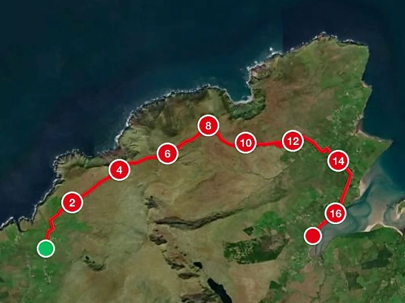 Day 3 (Saturday, 6 September 2025) – Cuas (An Chlais) to Cloghane (An Clochan): Our third day’s walk was both our shortest hike and our toughest day. We left An Bothar and climbed up to the pass between Masatiompan (which has been described as “a northern offshoot of Mount Brandon") and Mount Brandon itself. (The pass is near the six kilometre mark on this MapMyWalk plot of the route we took.) Rain and strong winds hit us when we reached the top of the pass, which made our subsequent descent somewhat slippery. The final couple of kilometres of our walk – along the road into Cloghane – were in heavy rain and, for the first and really only time we were walking the Dingle Way, we got drenched. |