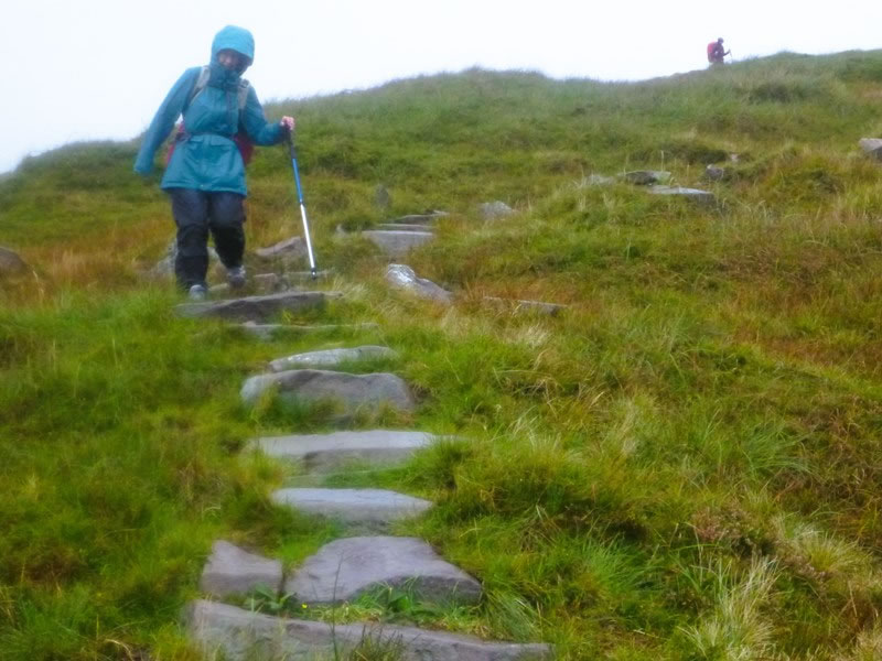 Day 3 (Saturday, 6 September 2025) – Cuas (An Chlais) to Cloghane (An Clochan): Hillwalk’s trip notes say that after leaving the top of the pass, the trail “starts to descend very steeply for a short period … [It] has been improved here recently with rugged stone steps to help on the steep and slippery sections. But we advise that you take extreme care along this part of the descent.” We definitely did so. |