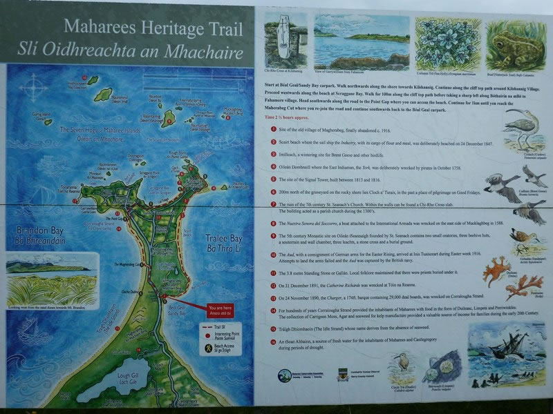 Day 5 (Monday, 8 September 2025) – Scraggane Pier to Camp (An Cam): … we were rather relieved to reach the end of the beach when we arrived at the place illustrated by the red ‘You are here’ arrow on this map of the Maharees Peninsula, and we then had to walk south along a road for a while. |