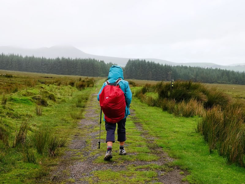 Heading down off the moors in light rain.