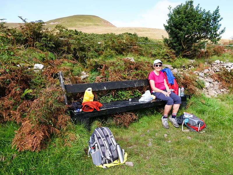 One o’clock – lunchtime – and as luck would have it, there was a wooden seat perfectly placed at the top of a small pass we’d climbed.