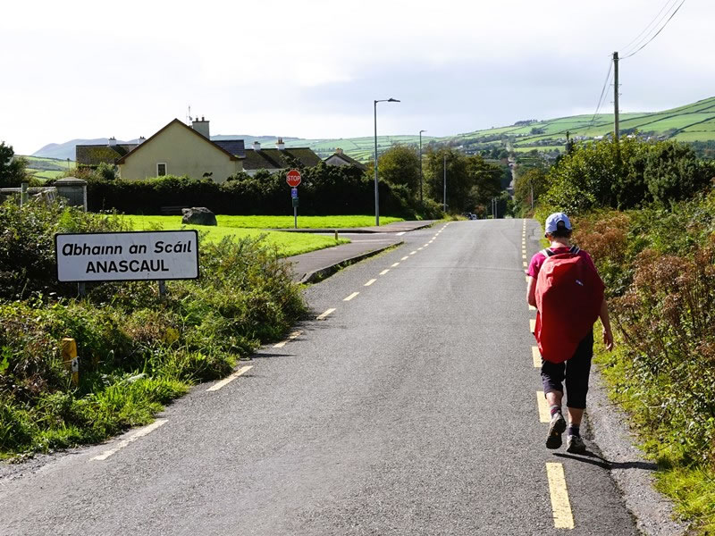 Day 6 (Tuesday, 9 September 2025) – Camp (An Cam) to Annascaul (Abhainn an Scail): Entering ‘Anascaul’ at 3:20 pm. Intriguingly, our Hillwalk trip notes, our official Dingle Way map, and most businesses and organisations in the village spell the town’s English name with two ‘n’s, but – as one website puts it – the “Kerry County Council and the National Roads Authority seem to prefer [it] with one ‘n’.” |