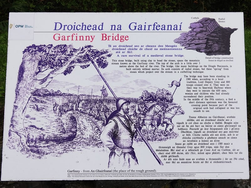 Day 7 (Wednesday, 10 September 2025) – Annascaul (Abhainn an Scail) to Dingle (Daingean Ui Chuis): According to local tradition, Arthur Grey, the Lord Deputy of Ireland (namely, the representative of the English monarch and head of the Irish executive) crossed the Garfinny bridge in 1580 with his troops on the way to the Siege of Smerwick, where – in an appalling instance of unnecessary violence against the Irish – they “executed … 600 men, women, and children who had already surrendered their position.” |