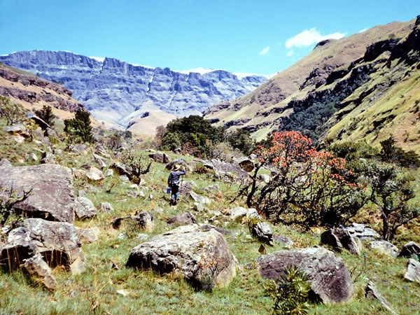 … hiking. This photograph by my father of me on a day-walk in the foothills of the Drakensberg mountains (taken during a late-winter / early spring holiday at Loteni) aptly illustrates the impressive nature of the Drakensberg escarpment. The Afrikaans and the Zulu names for the mountain range are both highly relevant: the Afrikaans name, Drakensberg, means Dragon Mountain; the Zulu name, Quathlamba, means Barrier of Upturned Spears. By way of contrast, the highest peak in the photograph (i.e., the one near the left-hand edge of the picture) has an almost unbelievably pedestrian English name – The Tent. Its height is more impressive though: it’s 10,269 feet / 3,130 metres above sea-level. |
