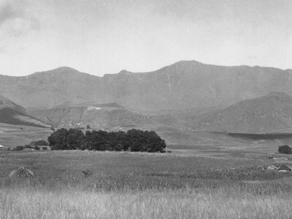 This is a black-and-white photograph that I took in April 1962 from a spot near our 1961 base camp. The area we climbed in is roughly above the clump of trees in the left-hand half of the picture. The peak on the skyline directly above the left-hand edge of the trees is Indumeni Dome (10,679 feet / 3,255 metres). The notch at the end of the right-hand slope down from the top of Indumeni Dome is Organ Pipes Pass. The peak on the skyline roughly above the middle of the stand of trees is Castle Buttress (10,016 feet / 3,053 metres), and the highest peak in the photograph (i.e., on the skyline just past the right-hand edge of the trees) is Cleft Peak (10,764 feet / 3,281metres). |
