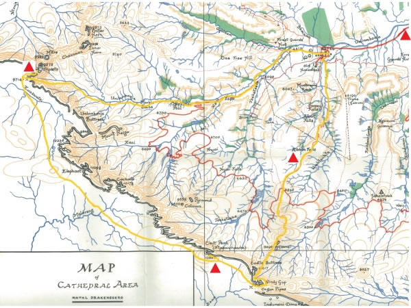 We chose the Cathedral Peak region in part because André and I’d been there before with Dave, but – more importantly – because it offered the prospect of a sensible round trip from a basecamp alongside the Mhlwazine river (the approximate site of which is shown by the red triangle near the upper right-hand edge of this picture) via the Ribbon Falls, up Organ Pipes Pass to Cleft Peak, across to the Twins Cave, down the Umlambonja Gulley, and then back to our campsite near the Mhlwazine river. During the climbing trip, we spent one night camping near the Ribbon Falls, two nights near the base of Cleft Peak, and two nights in the Twins Cave – and these spots are also marked on this map by red triangles. |