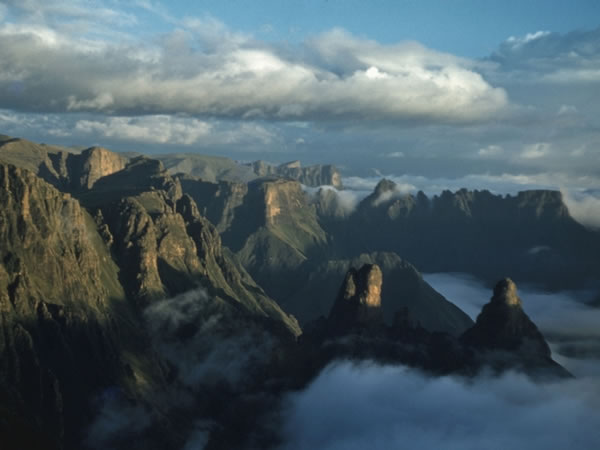 A view looking north from the summit of Cleft Peak after the first golden glows of sunrise had turned to silvery light. In the foreground, above the mist in the right-hand half of the photo, are the Column (on the left) and the Pyramid (on the right); in the middle distance, Mitre is above the Column and the Inner Horn is above the Pyramid, while between those two peaks there’s a ragged series of summits known as the Chessmen. |