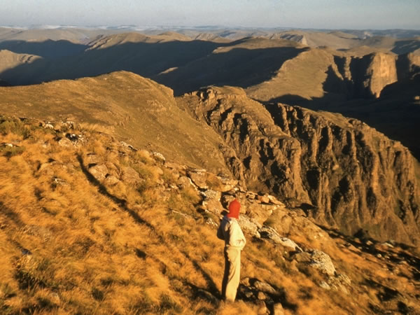 Shortly after the sun rose, I took this photograph looking down onto one of the members of our party standing below the summit of Cleft Peak and admiring the view. The hills on the horizon – well into what was Basutoland and is now Lesotho – have an early sprinkling of snow on them. |
