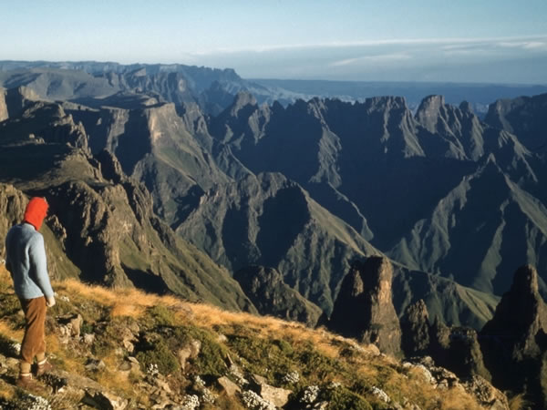Pip Cooper standing near the summit of Cleft Peak and looking down onto some of the mountains in the Cathedral Peak region.