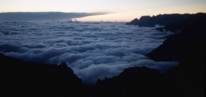 After our second night camping in the cave, we were rewarded with this wonderful panoramic view. As Gordon Martin wrote in his account of the trip, “The view was magnificent and the white clouds below us looked like a foaming sea breaking onto the rocks.” |