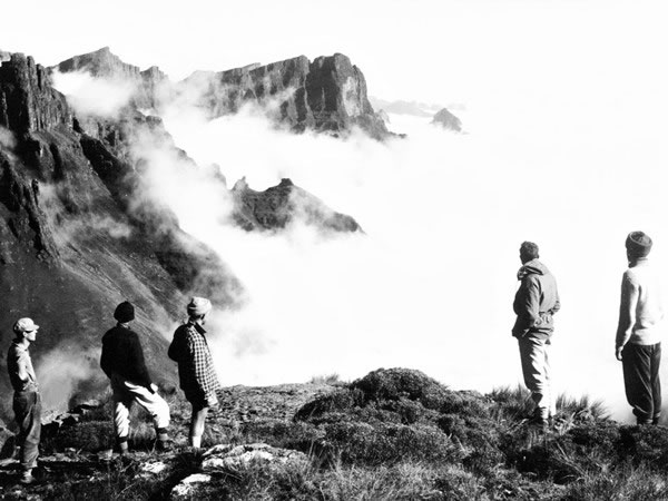Looking north across a sea of clouds are (from left to right) André le Roux, Carel Menke, Bill Moir, Dave Dodds, and Gordon Martin. This black-and-white photograph, which I took near Twins Cave, was one of seven pictures of mine that were later published in Dave Dodds’ book, A Cradle of Rivers: The Natal Drakensberg (although Gordon was cropped out of the photo in the book!). |