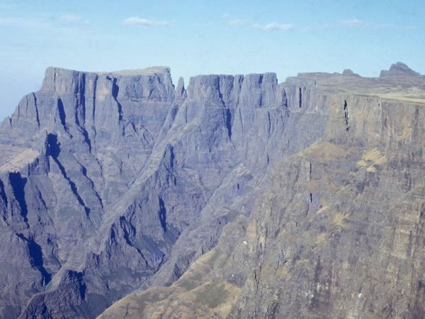 When we reached the Drakensberg plateau, we were rewarded with this magnificent view. From left to right, the peaks are the Eastern Buttress (3,047 metres / 9,997 feet), the Devil’s Tooth and – immediately next to and below it – the Toothpick, the Inner Tower’s Three Summits, and (on the right-hand edge of the picture) Mt Amery, the summit of which is 3,143 metres / 10,312 feet above sea-level. |