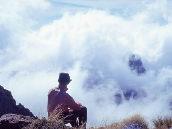 Looking down onto Bill Moir as he looks down onto clouds filling the amphitheatre.