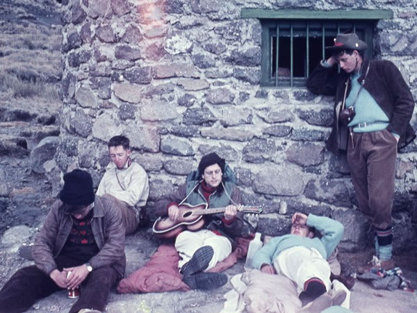 … the Mont-aux-Sources hut. From left to right are John Cooper, Bill Moir, Dave Dodds, Gordon Martin, and Pip Cooper.