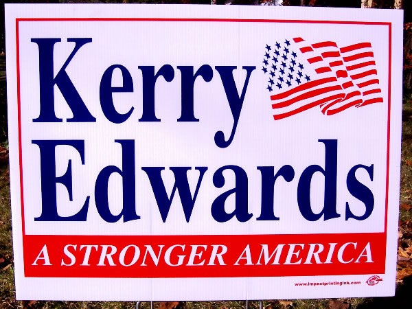 John Kerry and John Edwards (senators from Massachusetts and North Carolina respectively) were the Democrats’ candidates for the Presidency and Vice-Presidency. It’s worth noting that the words “Democratic Party” are conspicuous by their absence from this sign, and that the phrase “Republican Party” was in tiny type and barely visible on the Bush-Cheney sign in the previous picture. |