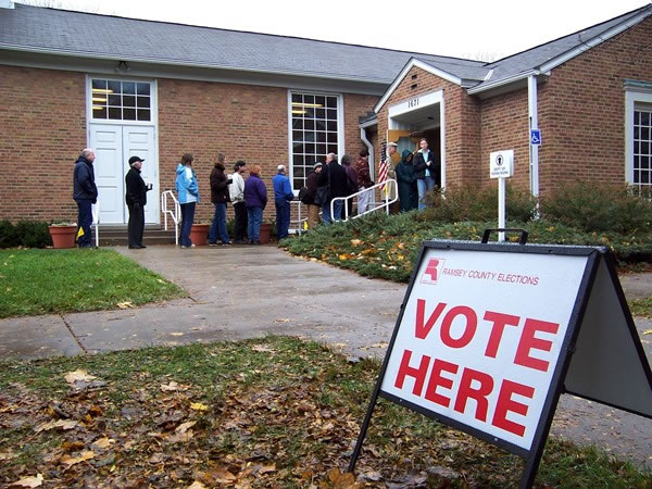 Tuesday, 2 November 2004, was election-day in the United States. This photograph of voters queuing up (or, as Americans would put it, standing in line) outside a polling station was taken in St Paul, Minnesota’s capital city.