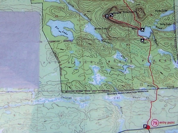 This photograph of part of the map on the notice board at the trailhead shows the route we hiked in order to reach the summit of Eagle Mountain. Initially we headed due north, and after about a mile / 1.6 kilometres we entered the Boundary Waters Canoe Area Wilderness. We continued hiking north until we reached Whale Lake. We skirted the western edges of the lake, and then – heading north-west – climbed to the top of Eagle Mountain. |
