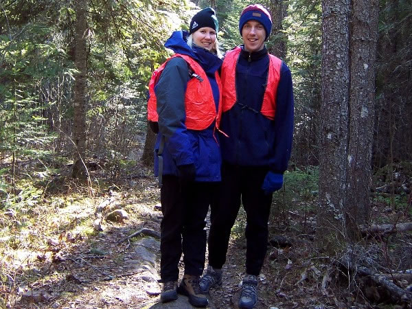 Cathy Fitch and Evan Roberts about to set off at 12:30 pm from the trailhead. It was deer hunting season in northern Minnesota, so the three of us wore bright red vests to let hunters know we were not deer! As the trailhead is 1,720 feet / 524 metres above sea-level, we had to ascend 581 feet / 177 metres during a hike of roughly three miles / five kilometres in order to reach the top of Eagle Mountain. |
