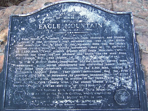 … the summit of Eagle Mountain, which we reached at 2:25 pm on Friday, 12 November 2004. It had taken us just under two hours to hike from the trailhead to the top of Eagle Mountain. This plaque at the top of the mountain records the fact that in the 1890s it was thought that a peak in the Misquah Hills was the highest point in Minnesota, but that in 1961 a United States Department of the Interior survey team “using aerial photographs and controlled bench marks” determined that Eagle Mountain – at 2,301 feet / 701 metres above sea-level – was the true highpoint of Minnesota. The plaque also notes that “the igneous rock composing Eagle Mountain is … over a billion years in age.” |