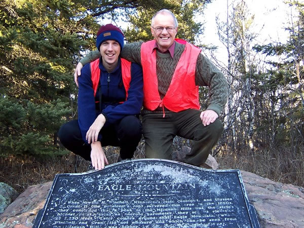 A father-and-son photograph at the top of Eagle Mountain, which was Evan’s first US state highpoint …
