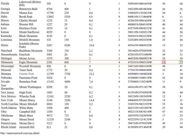 After I’d climbed Eagle Mountain, I was intrigued to learn that although it is the 37th highest of the fifty US state highpoints (see the number in the green square), it’s nevertheless regarded – as this extract from the America’s Roof website shows – as the 18th hardest state highpoint to climb (see the red square). Pondering these facts had a major effect on me. I concluded that as I’d already climbed Denali / Mt McKinley – the highest and hardest of the United States’ highpoints – I would try to climb all thirteen of the US state highpoints that together constitute the ten highest and the ten hardest of the state highpoints to climb. The thirteen peaks account for all the US state highpoints that are over 10,000 feet / 3,000 metres high. My quest to climb the remaining twelve of the 13 highpoints began on Wyoming’s Gannett Peak in July 2006 and ended nearly eight years later on Hawaii’s Mauna Kea. It should also be noted that I climbed ten of the remaining twelve peaks together with Eric Hodge, my Canberra-based climbing partner, to whom I’ll always be extremely grateful. |