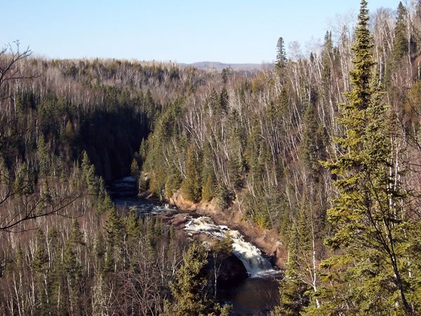 This is a photograph taken from the Superior Hiking Trail looking down onto the Brule River, which is flanked on both banks by a mixed birch and pine forest.