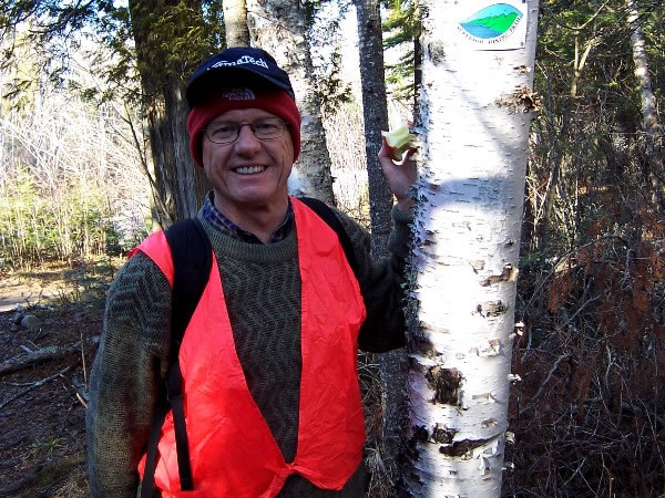 Posing (with an apple core) next to a birch tree displaying a Superior Hiking Trail sign.